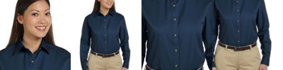 100% cotton denim; Inside, flat-felled seams; Khaki double-needle topstitching; Left-chest pocket and signature twill tape at neck; Fully constructed front placket with button-down collar; Signature horn-style buttons with Harriton logo; Buttons use contrast thread;